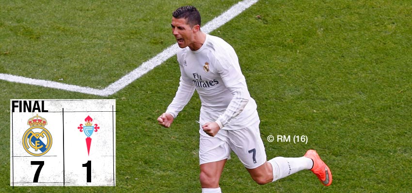 Kembalinya Los Blancos ke Stadion Ikonik. Cristiano Ronaldo scored four second-half goals as Real Madrid thumped Celta Vigo 7-1 to ease the pressure on boss Zinedine Zidane. The referee brings the second period to a close with Real Madrid running out 7-1.